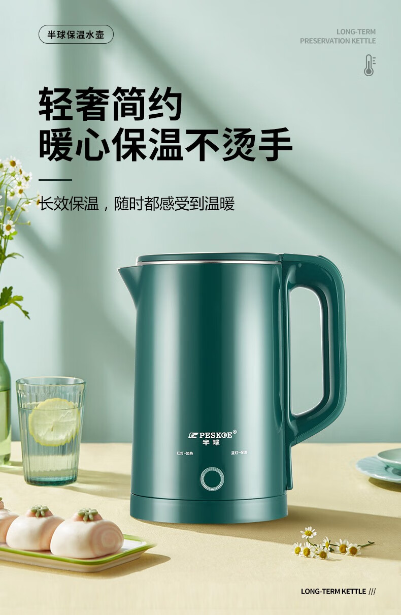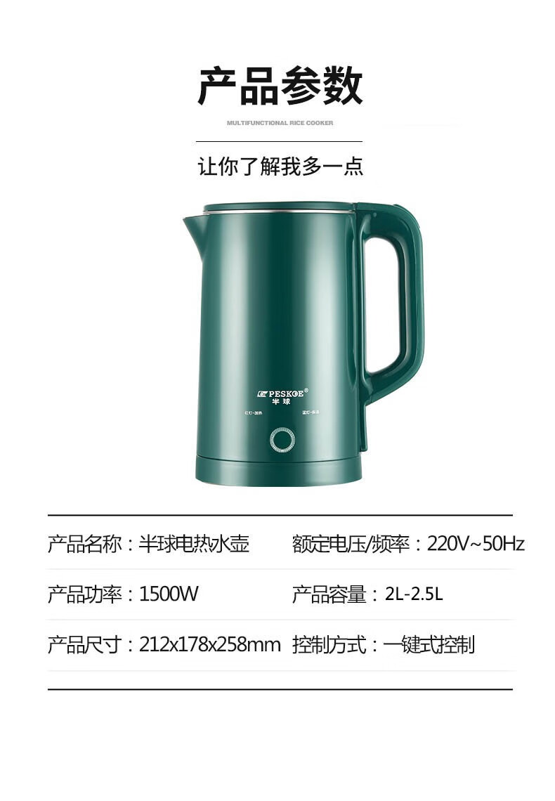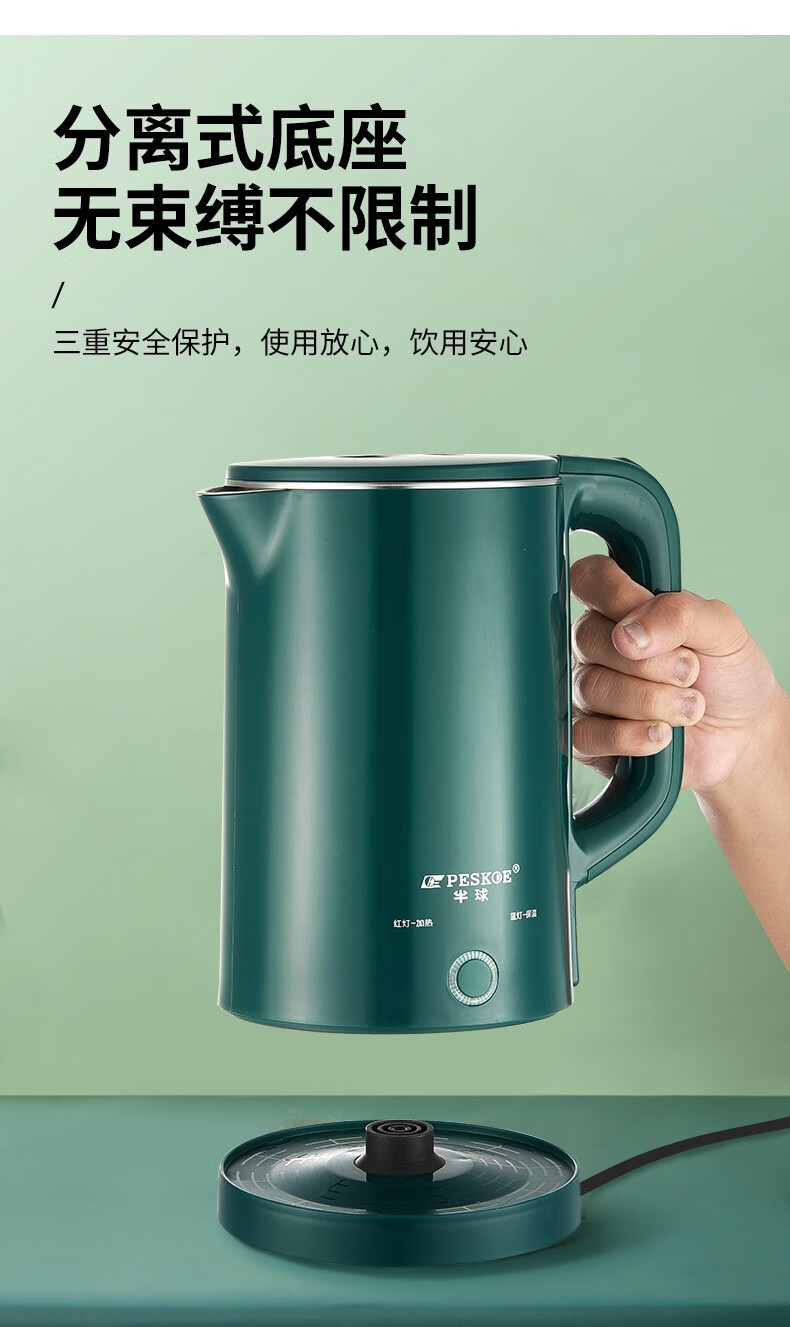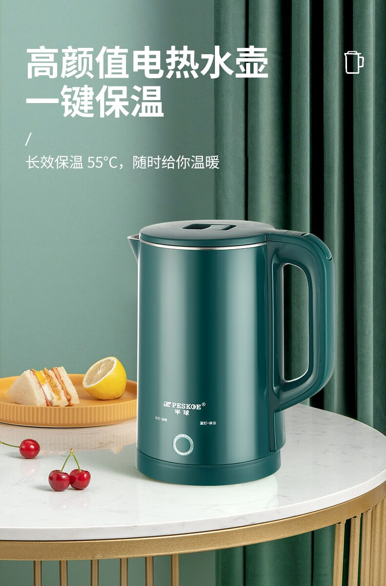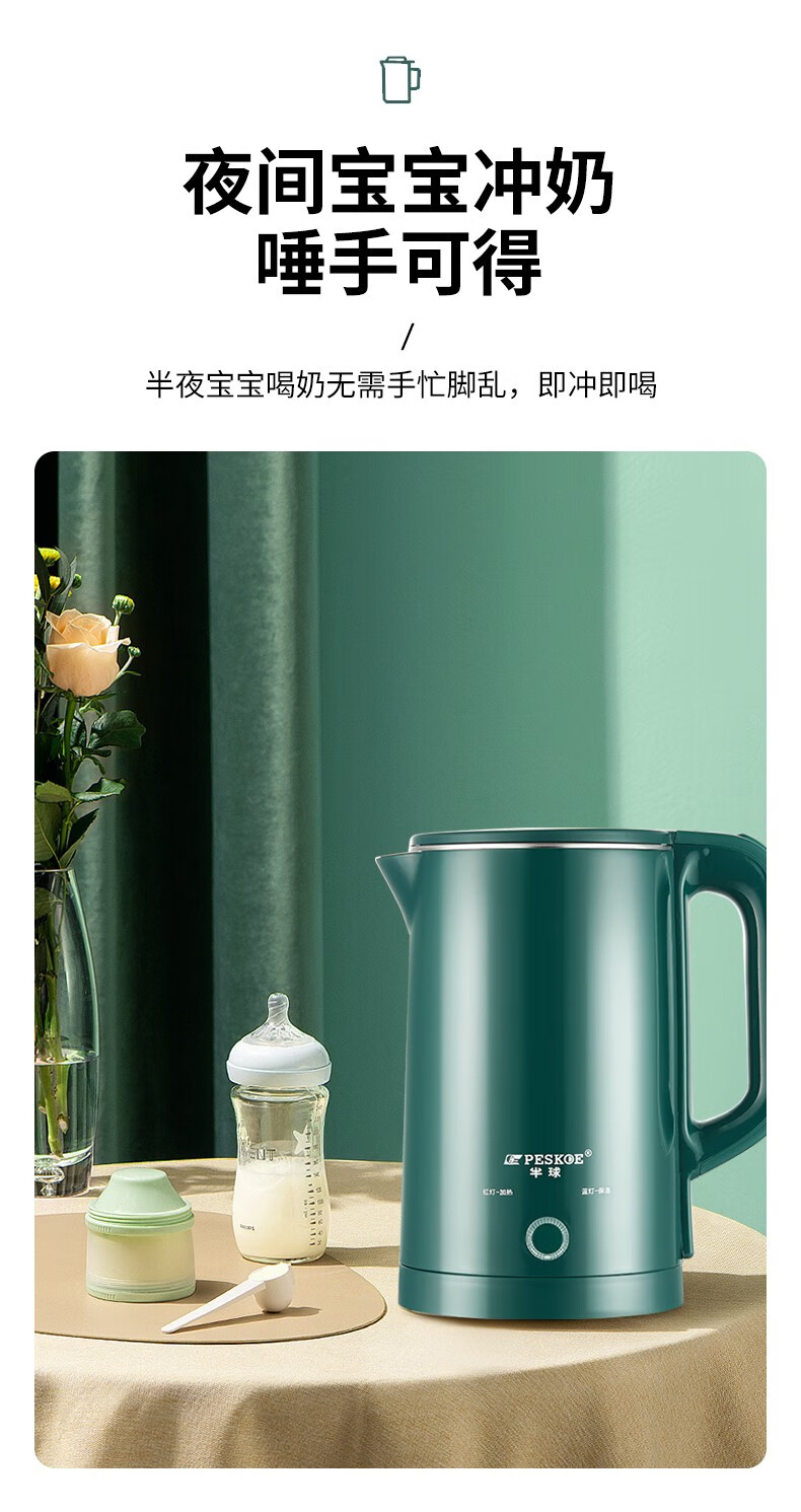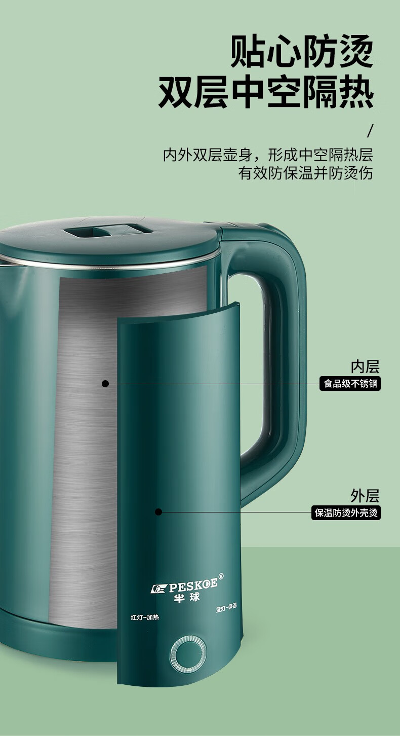 半球(PESKOE)电热水壶家用不锈钢热水壶双层防烫烧水壶大容量自动断电防干烧2.5升绿色(无保温)普通快递